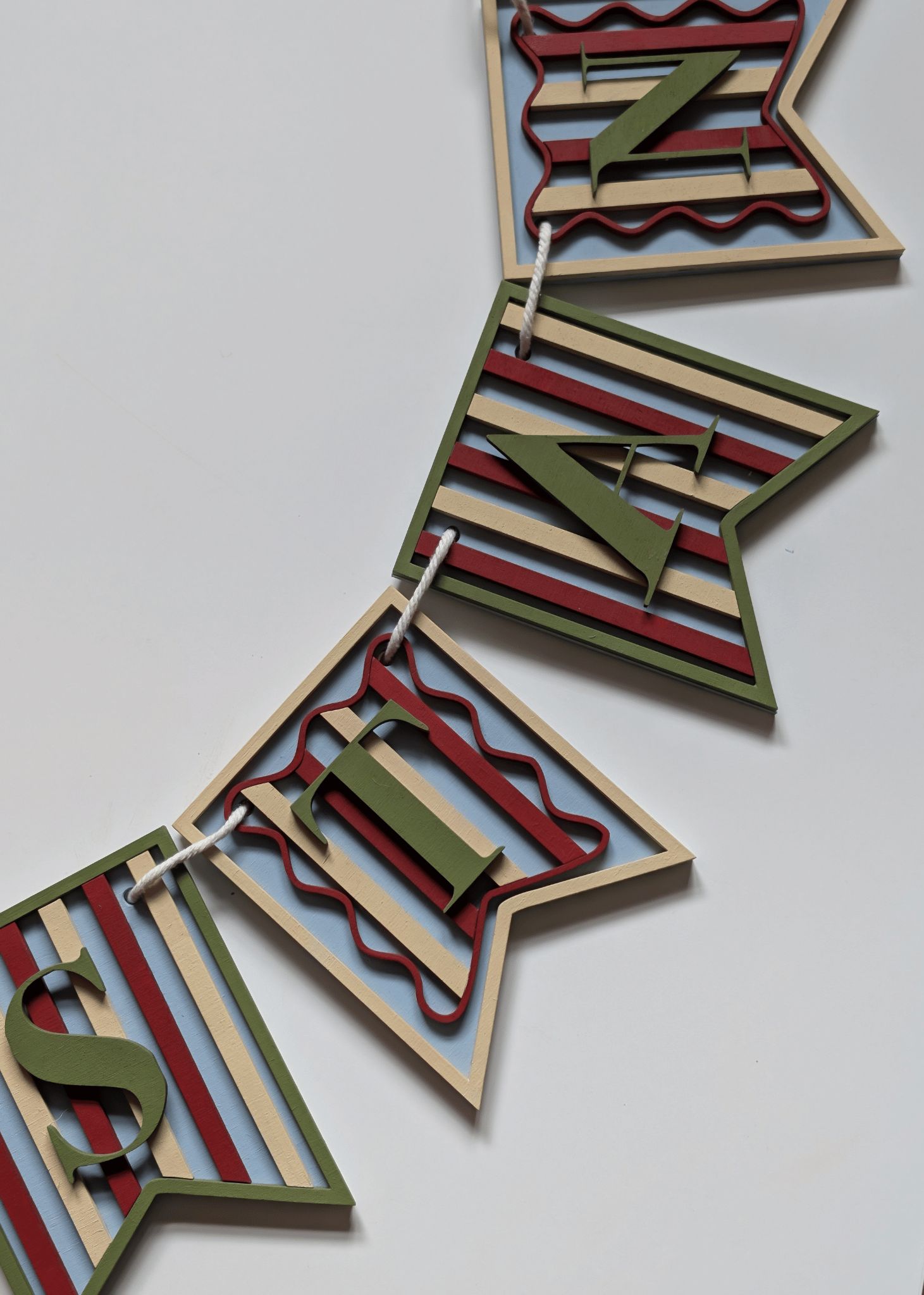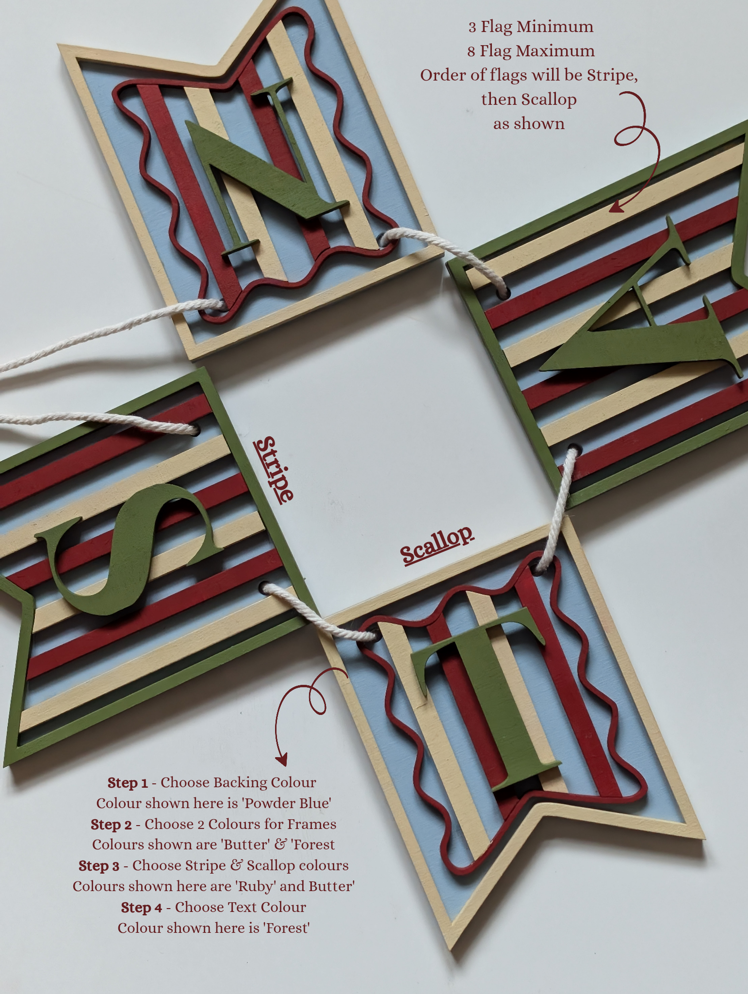 Each flag is completely handmade from high quality wood and fully customisable. Designed in a classic W shape, each piece features a stripe section followed by a scalloped section for that true vintage feel. Choose your colours using my selection boxes to create your perfect palette. Bunting comes pre-strung and ready to hang.